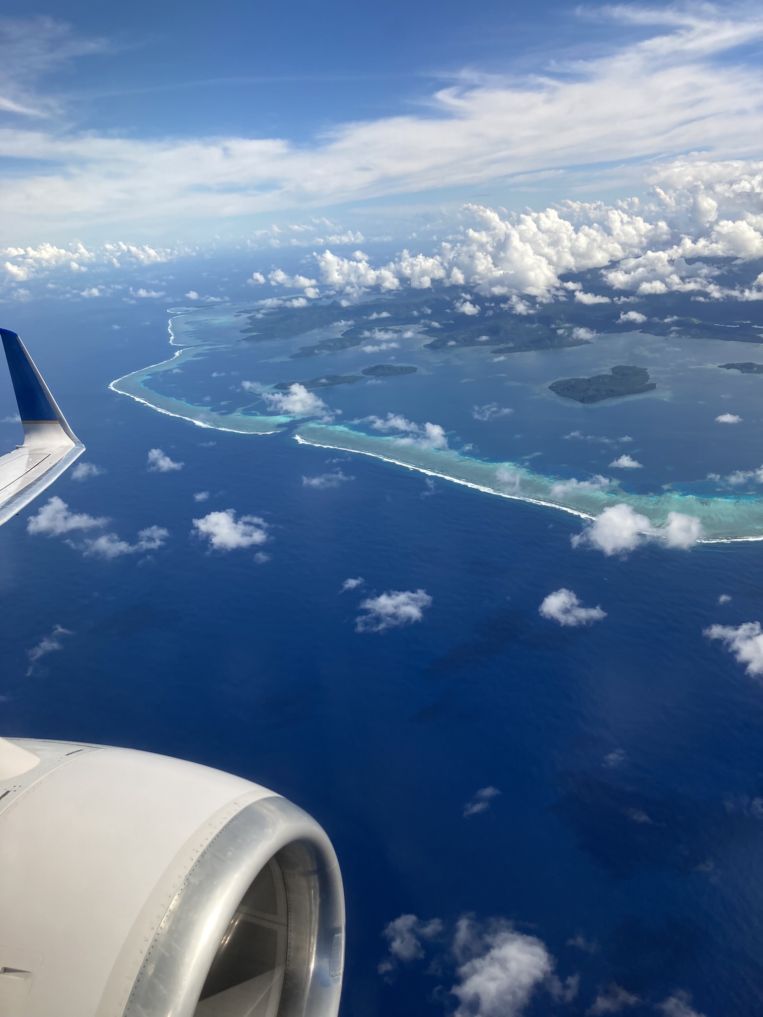 • Final flight leg from Kosrae to Pohnpei with dramatic views of volcanic landscape and barrier reefs